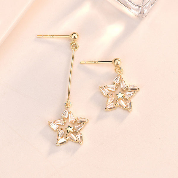 Elevate your accessory game with our Asymmetry Shining CZ Star Dangling Earrings, crafted for those who appreciate elegance and unique design. These stunning earrings feature a beautiful asymmetrical star shape that adds a touch of modern flair to any outfit.